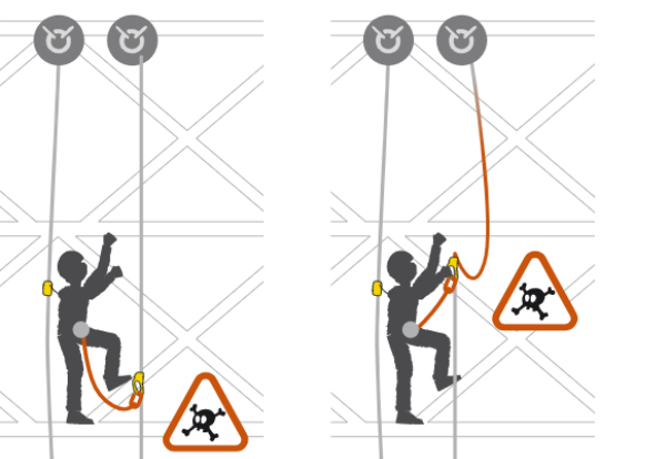 手升又稱為連接牛尾,牛尾為使用者提供了便利性和移動性,但也帶來了風險,使用者稍加疏忽,可能會位于抓繩器之上,或牛尾松弛,這就帶來了潛在的墜落風險。和胸升一樣,我們需要盡可能保持其受力狀態,以減少自由墜落的可能。